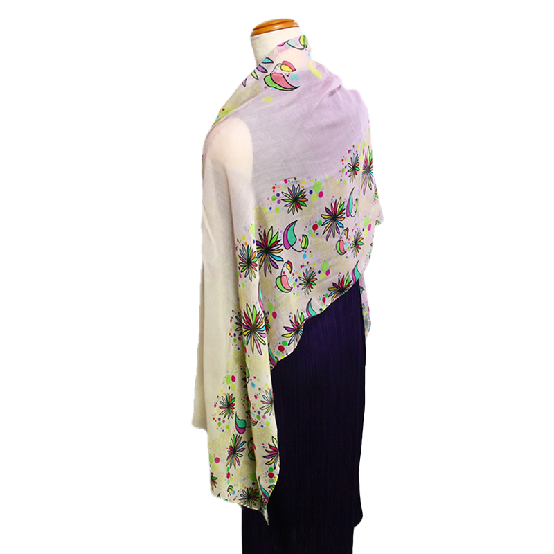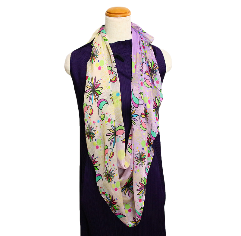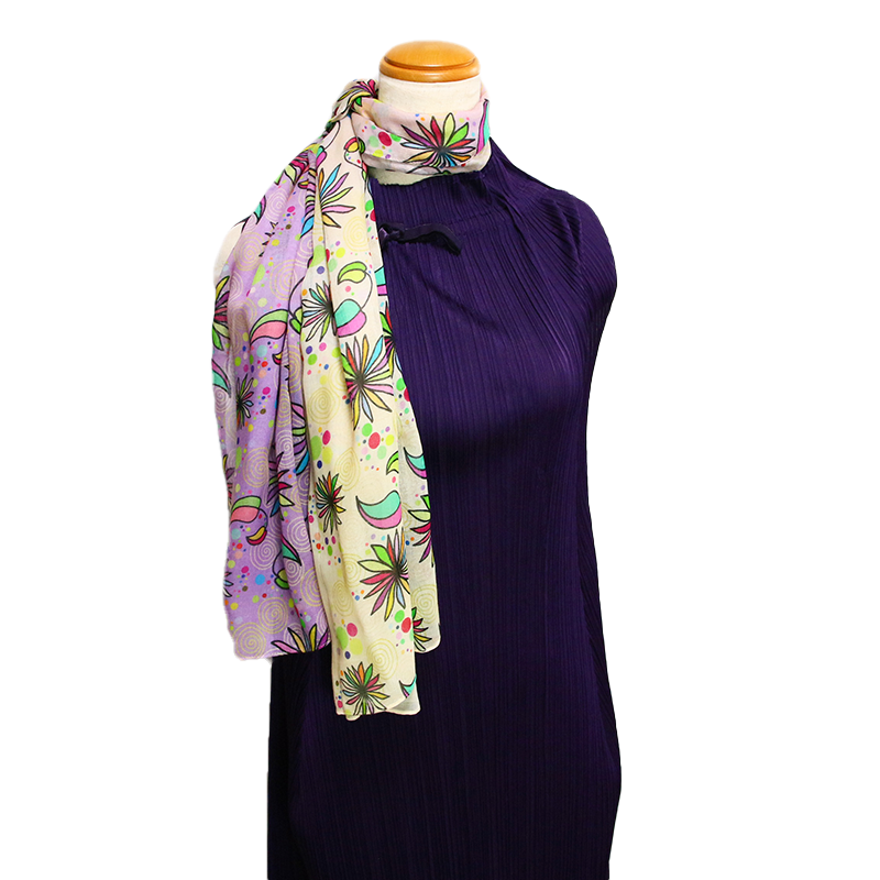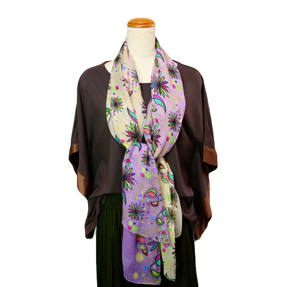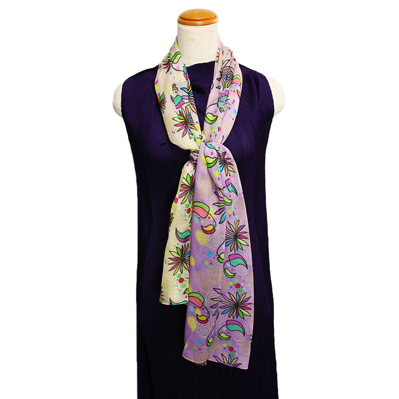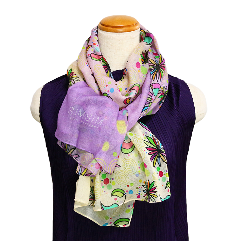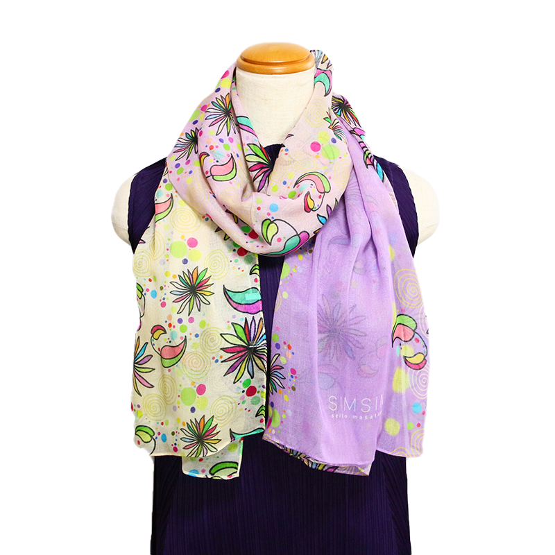 「エスニックフラワー」は、アジアンテイストにSIMSIMデザイナーの正谷聖子がデザインしたストールです。うずまき柄は、生命の源をイメージし、力強く花咲くエネルギーを表現しています。縦に、華やかな部分とシンプルな部分を作っているので、出す方を変えるだけでガラリと印象を変えれます。