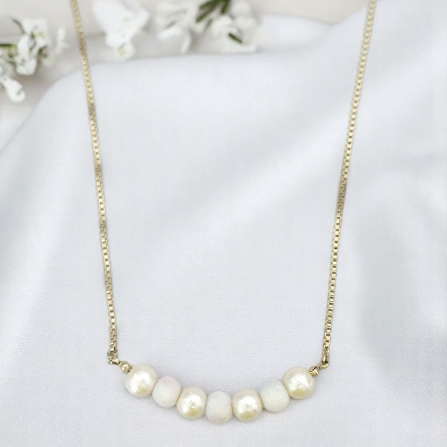 キラッとさり気なく光るチェーンを使用し、上品で知的な印象に。コットンパールとフェルトジュエリーが交互に入るデザインが、優しく甘いテイストを加えます。爽やかな印象もあるので、オールシーズン使いやすいデザインです。オフィス使いなどキチっとしたシチュエーションにも。