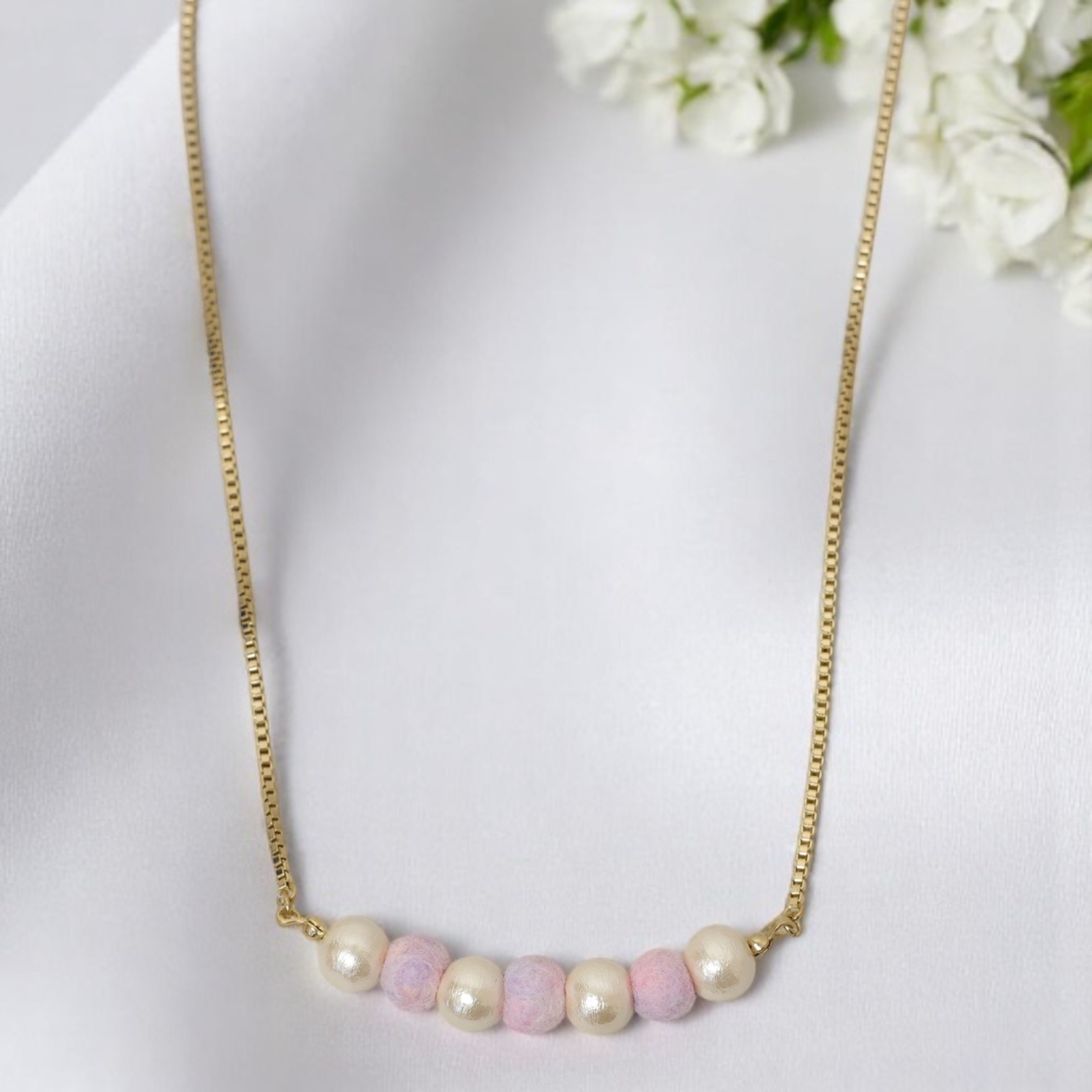 キラッとさり気なく光るチェーンを使用し、上品で知的な印象に。コットンパールとフェルトジュエリーが交互に入るデザインが、優しく甘いテイストを加えます。爽やかな印象もあるので、オールシーズン使いやすいデザインです。オフィス使いなどキチっとしたシチュエーションにも。