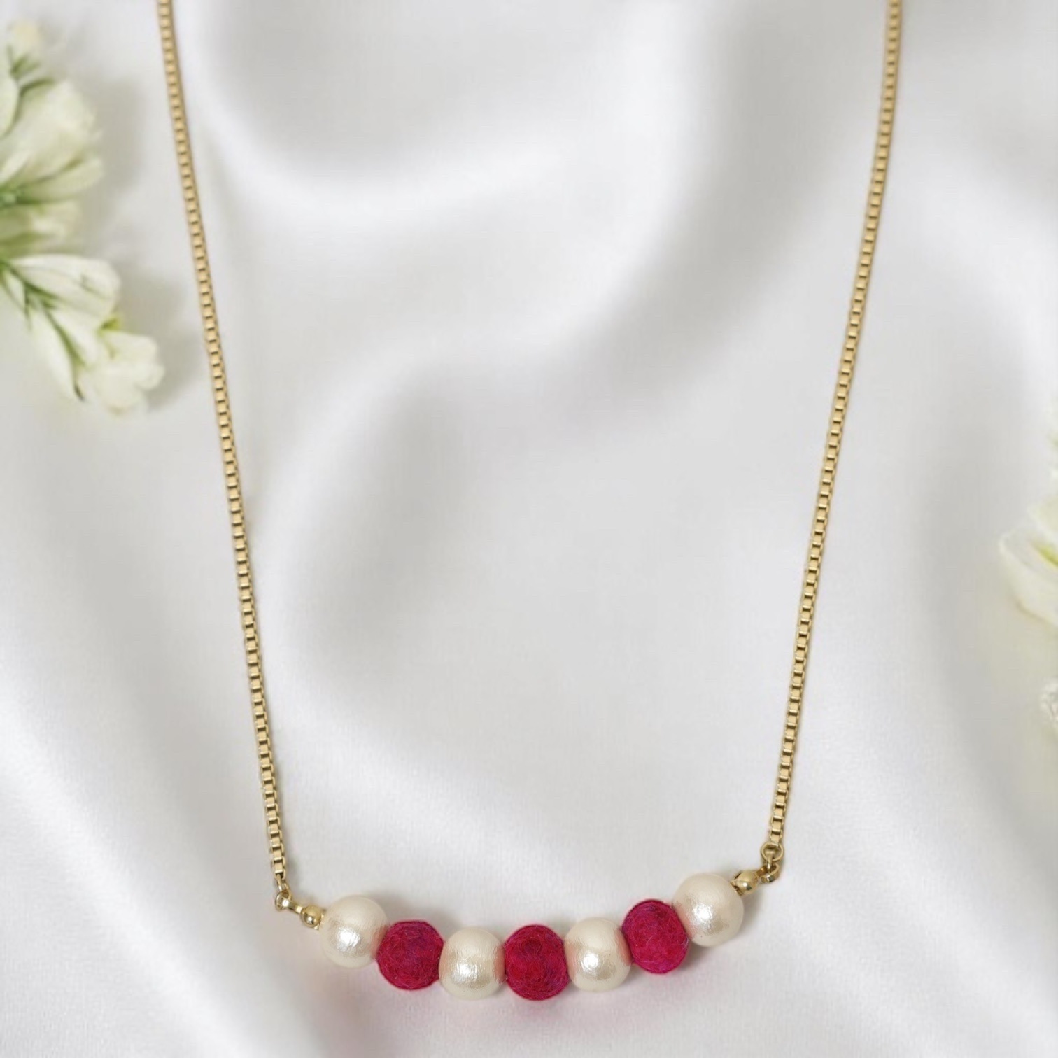 キラッとさり気なく光るチェーンを使用し、上品で知的な印象に。コットンパールとフェルトジュエリーが交互に入るデザインが、優しく甘いテイストを加えます。爽やかな印象もあるので、オールシーズン使いやすいデザインです。オフィス使いなどキチっとしたシチュエーションにも。