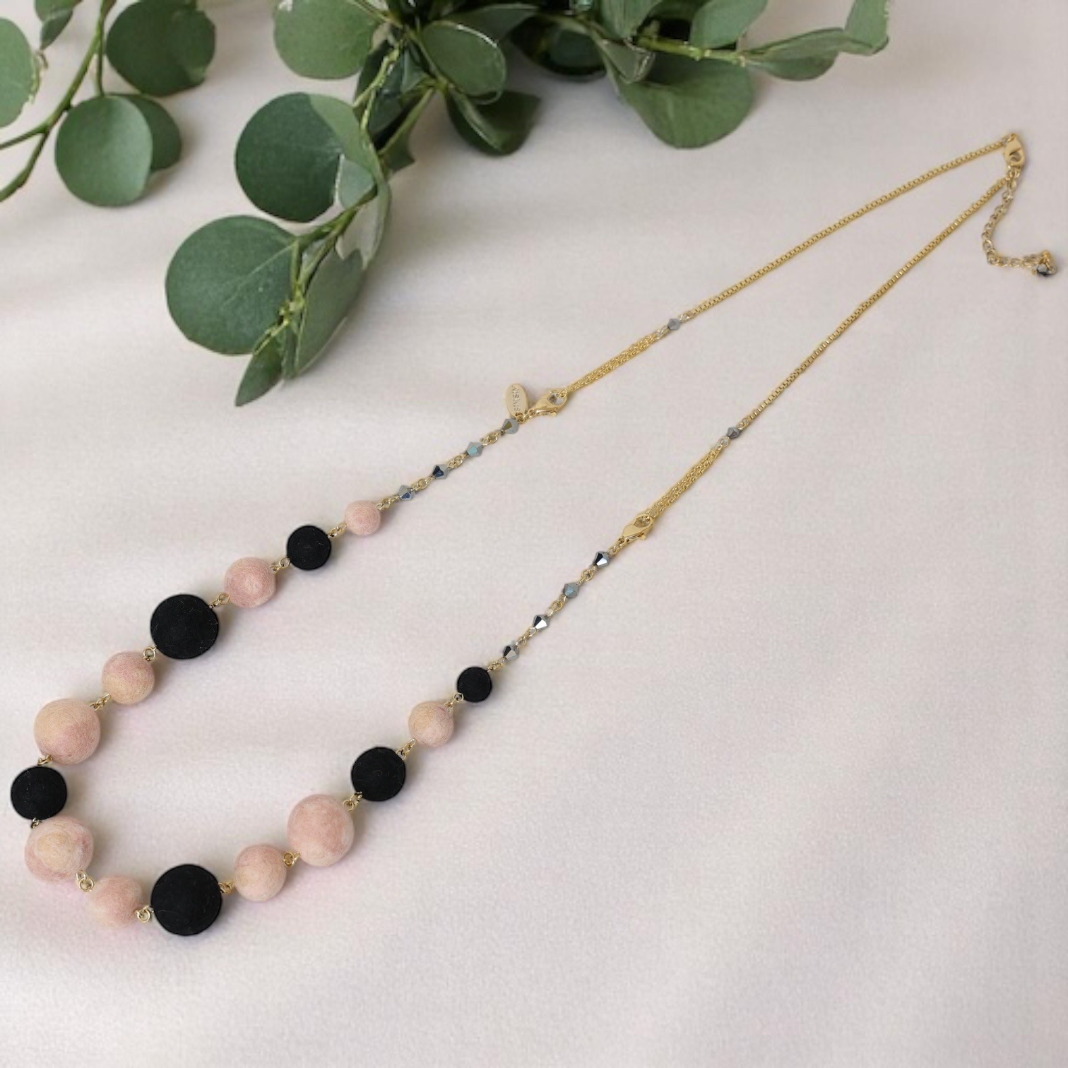 2wayなので、ロングネックレスとチェーンを取り外してショートネックレスに。全く雰囲気を変えてコーディネートできるのでかなり重宝します。しかも、チェーンを1本だけ外すとその中間のミドルの長さにも。実は3通りも使える万能ネックレス。つけているとそのインパクトや素材感のわからない不思議さから注目されます。