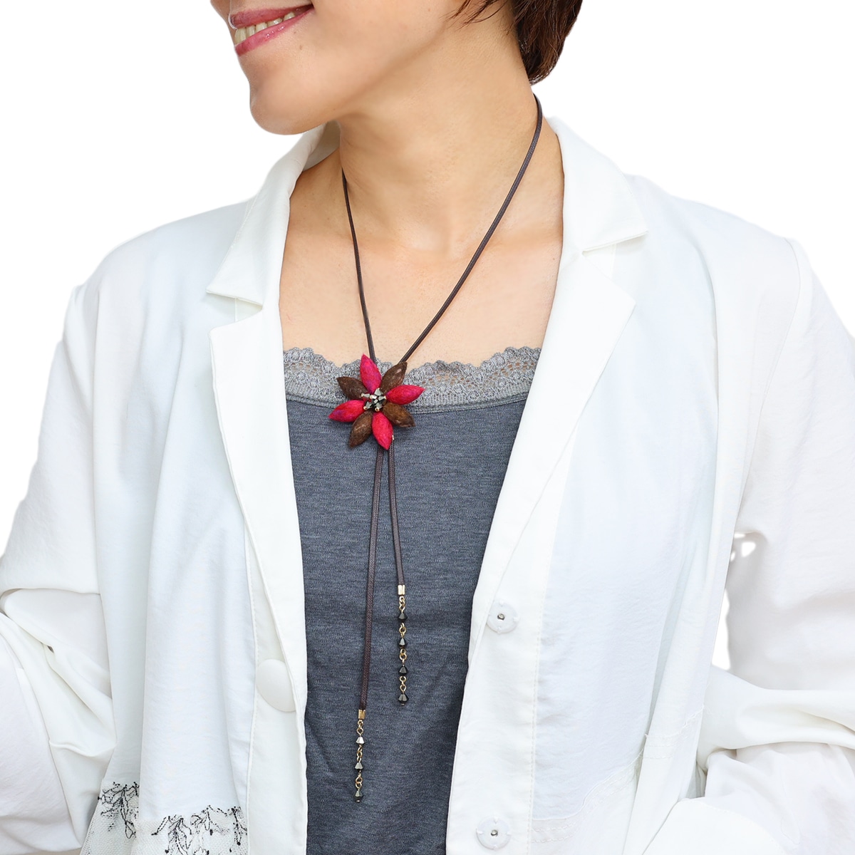 綿素材のコードを使用し、ナチュラルスタイルに仕上げたネックレス。