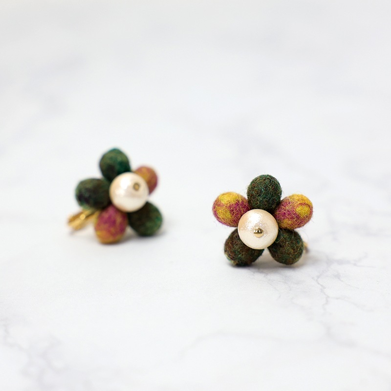 ※ピアスはキャッチ式ですが多少下を向いてしまうので、イヤリングの方がお花が正面を向きます。このデザインに関してはピアスがあいている方もイヤリングがおすすめです。