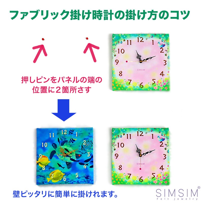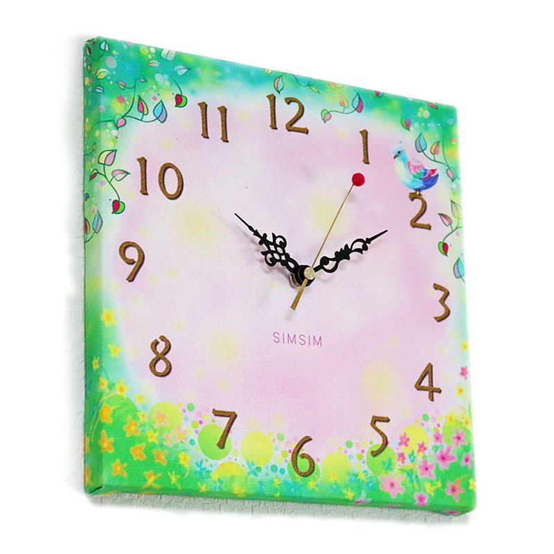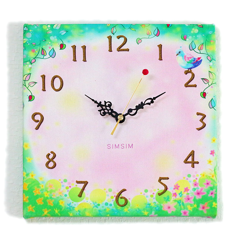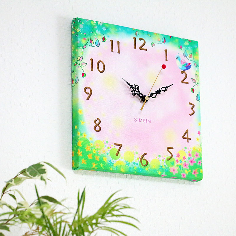 キャンバス生地にプリントすることによって、絵画のような風合いを出しています。SIMSIMオリジナルのアイデアで、パネルを掛け時計にして作り上げました。