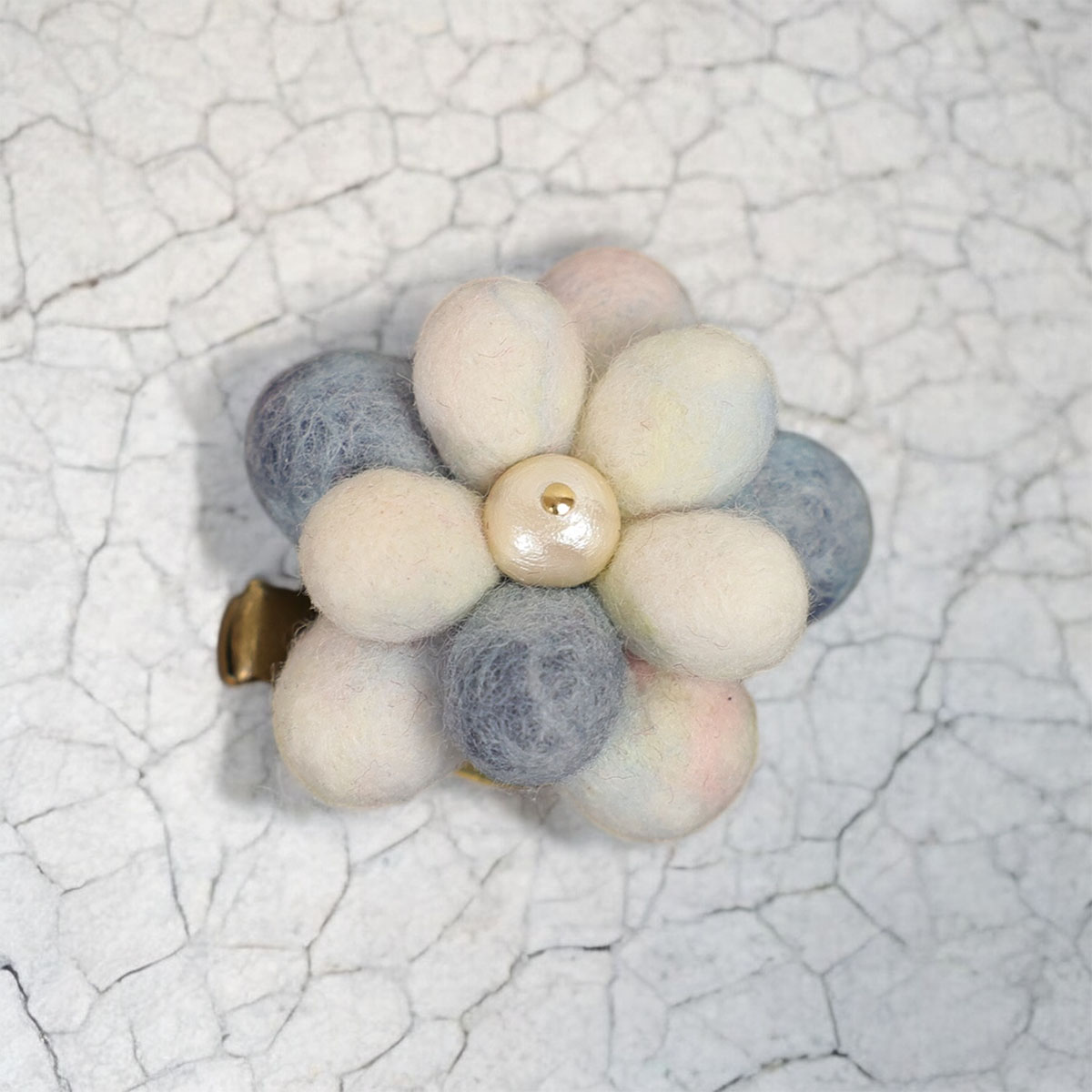 ぷっくりとかわいらしいしずく型のお花が2段に重なったデザイン。丸みを帯びたフォルムなので愛らしく、中心のコットンパールが上品な印象を与えます。こぶりなのでワンポイントに気軽に使っていただけます。
