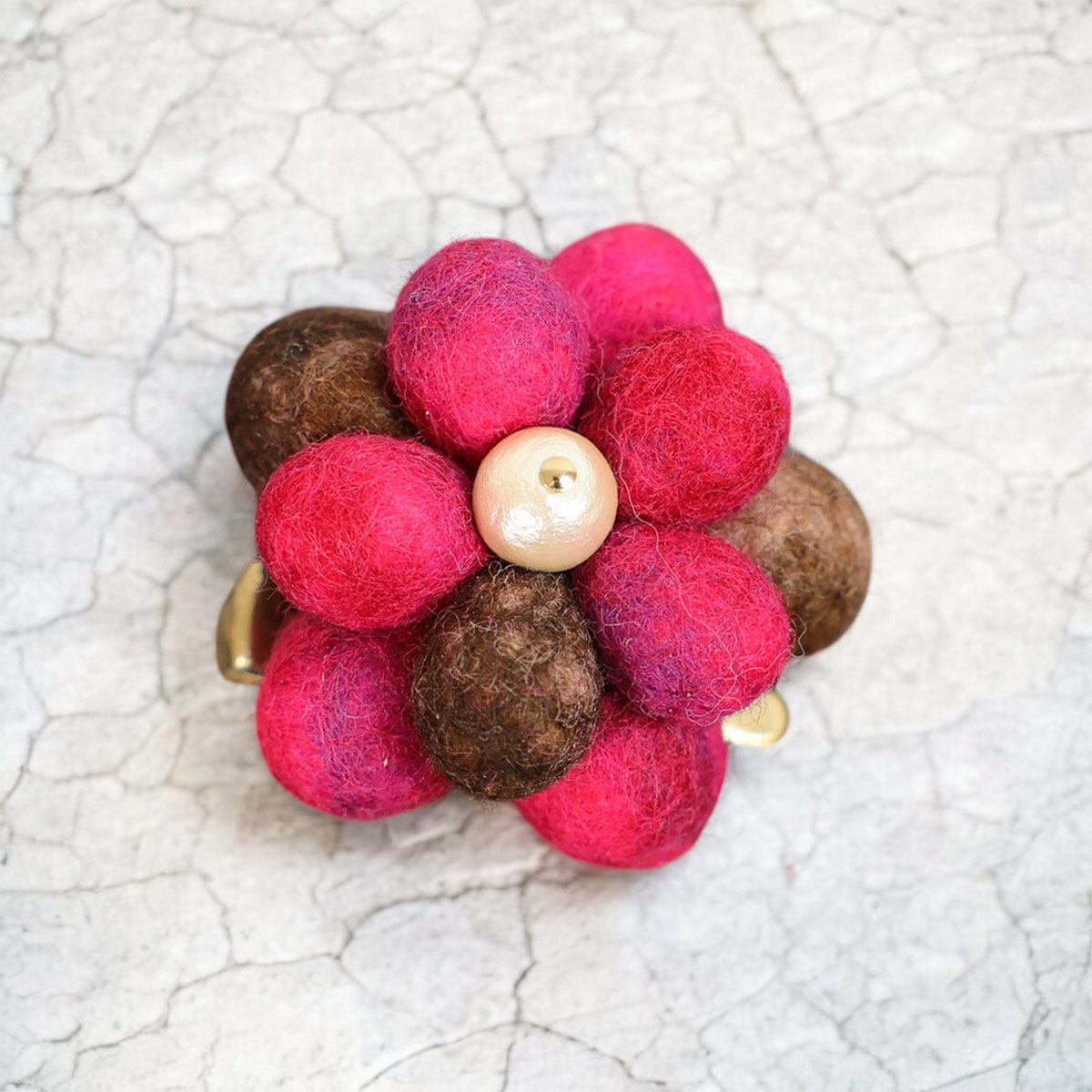 ぷっくりとかわいらしいしずく型のお花が2段に重なったデザイン。丸みを帯びたフォルムなので愛らしく、中心のコットンパールが上品な印象を与えます。こぶりなのでワンポイントに気軽に使っていただけます。