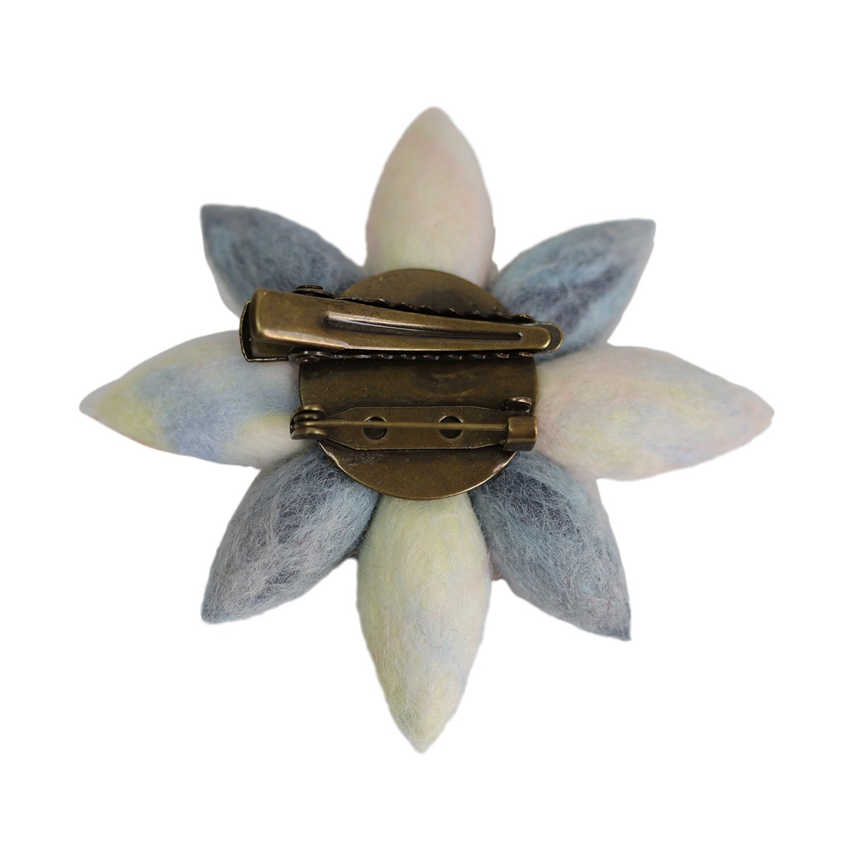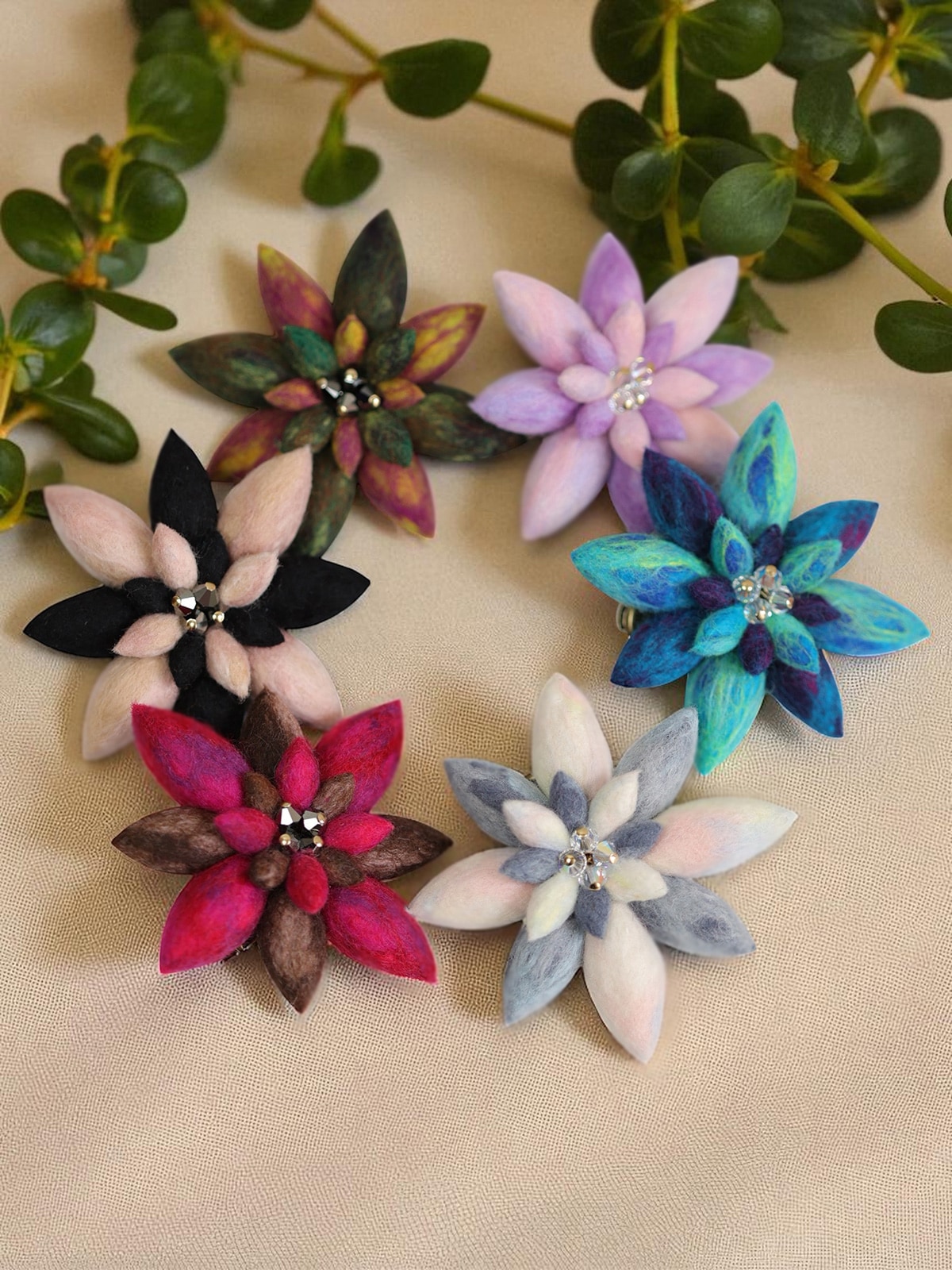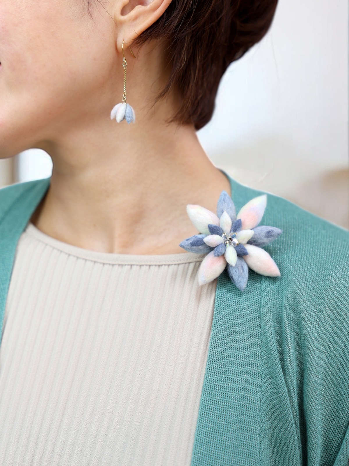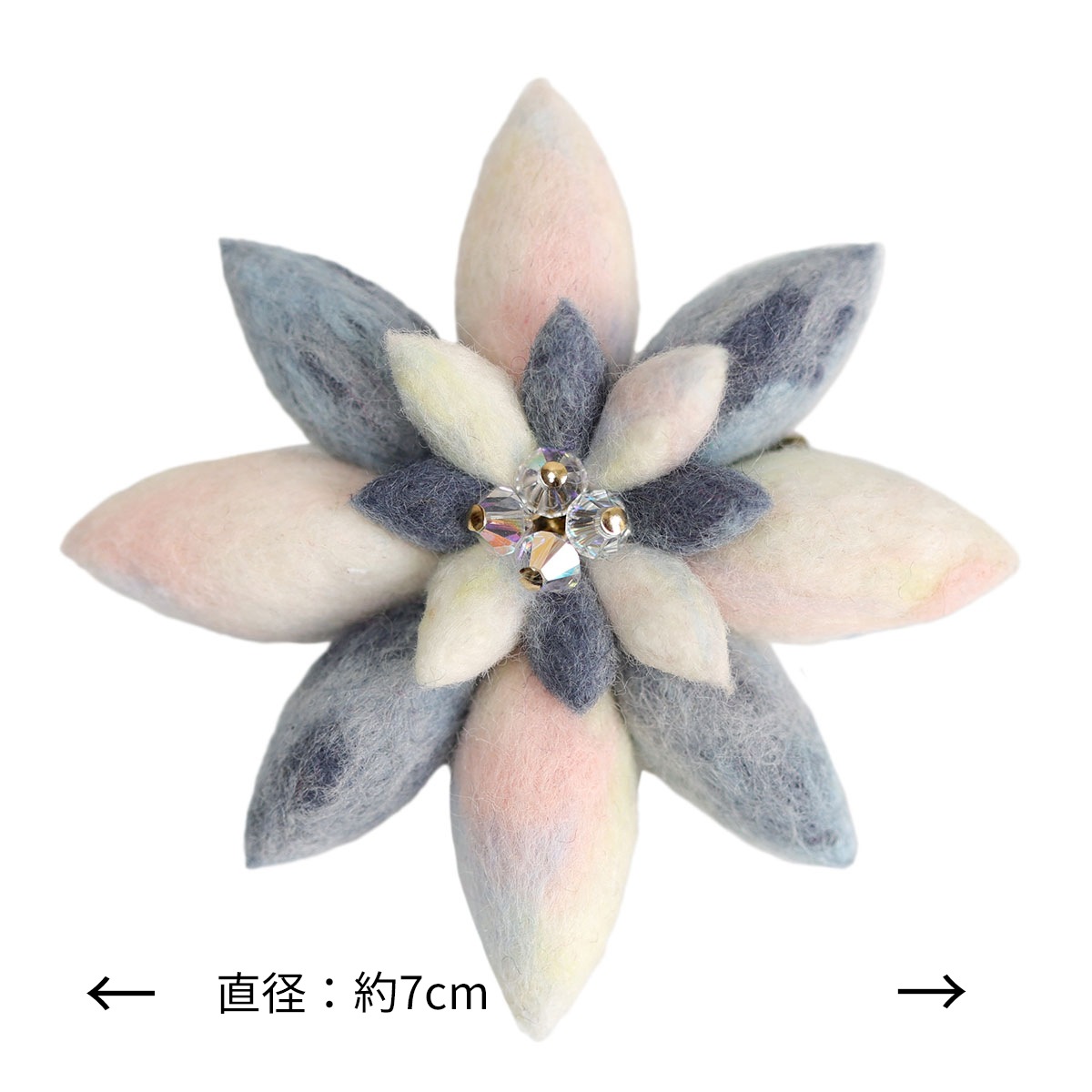 柔らかなフェルトを重ねた立体的な花びらが、中心のビジューとともにきらめき、コーディネートをぐっと華やかにしてくれます。