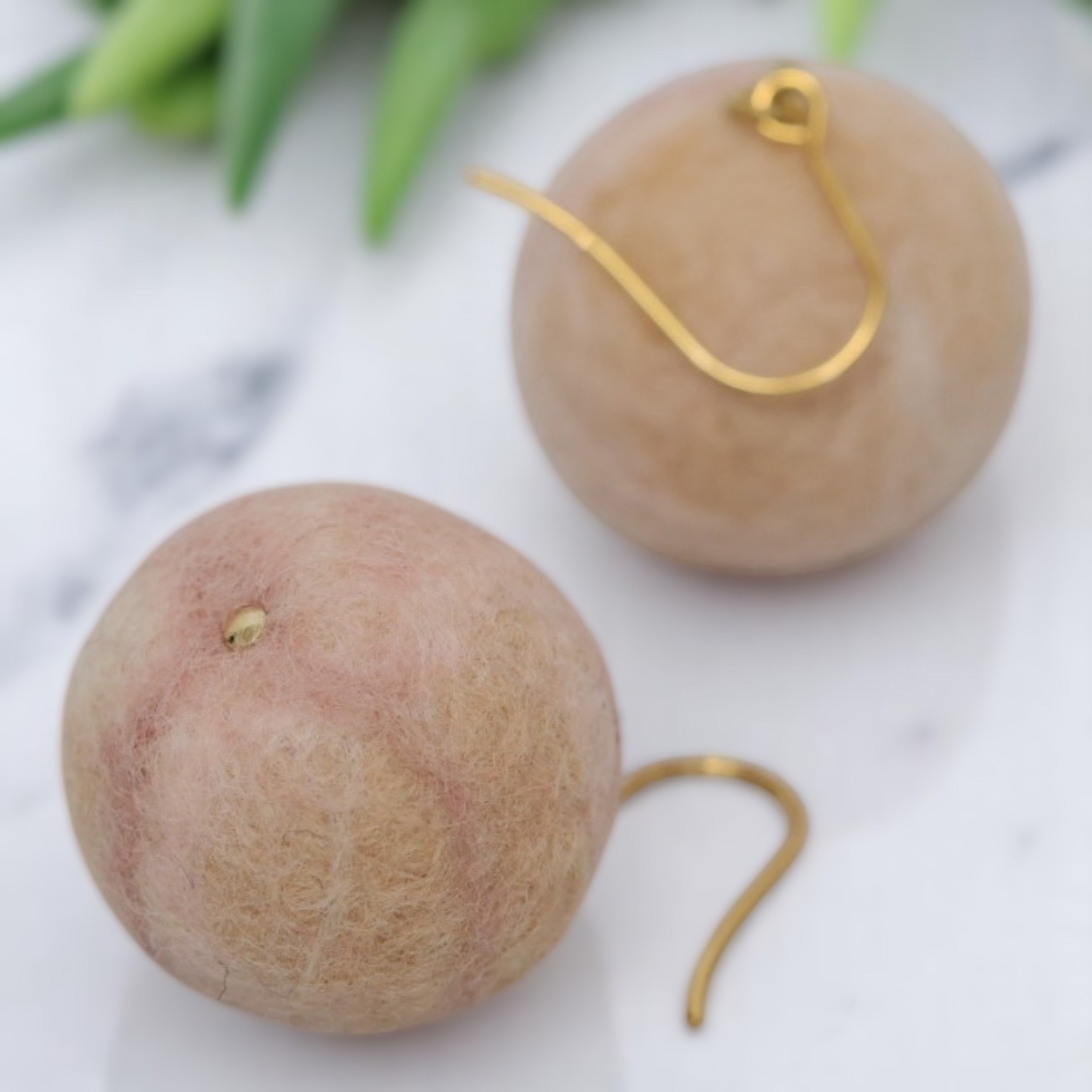 雪のようにふわっとした印象のスノーデザインは、マーブルの美しさがよく見え、マット感が優しいニュアンスになります。大きくてもとっても軽いのも魅力です。ひとつのフェルトジュエリーはたったの1.8g。1円玉2枚より軽く、つけていることを忘れるほどです。