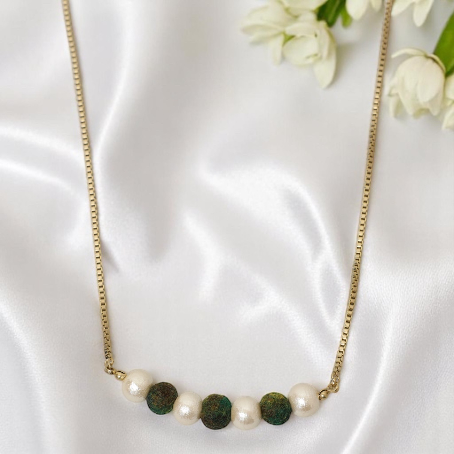 キラッとさり気なく光るチェーンを使用し、上品で知的な印象に。コットンパールとフェルトジュエリーが交互に入るデザインが、優しく甘いテイストを加えます。爽やかな印象もあるので、オールシーズン使いやすいデザインです。オフィス使いなどキチっとしたシチュエーションにも。