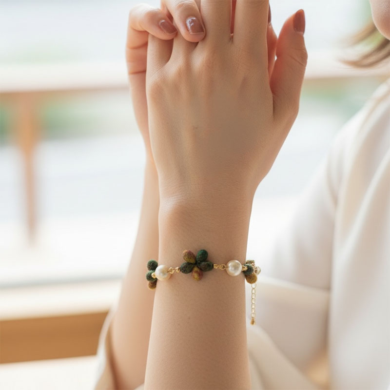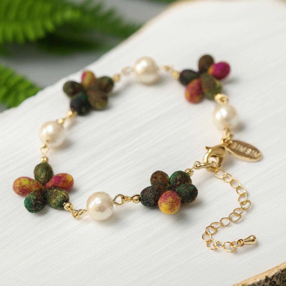 やわらかな色を重ねたスミレの小花を贅沢にあしらったブレスレット。