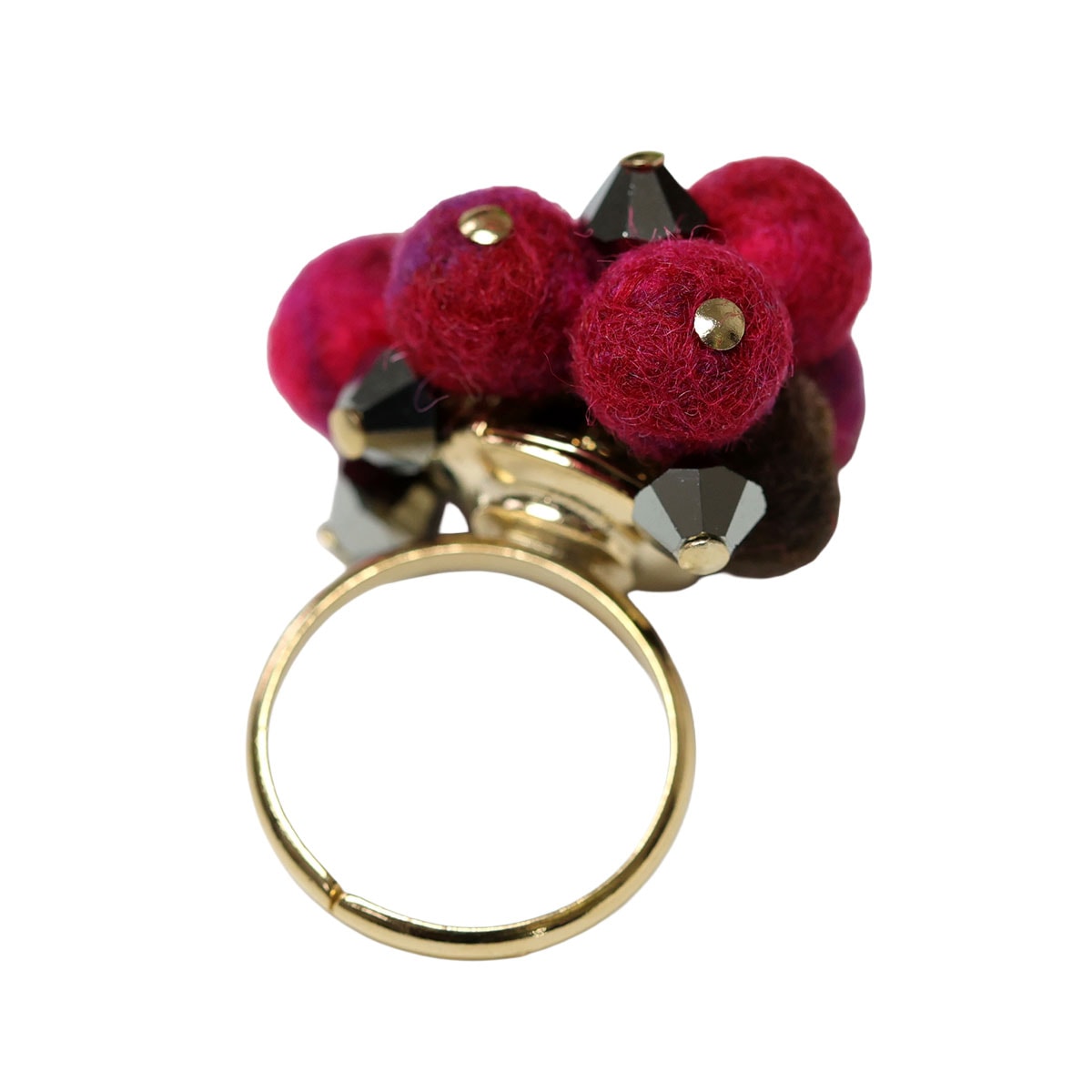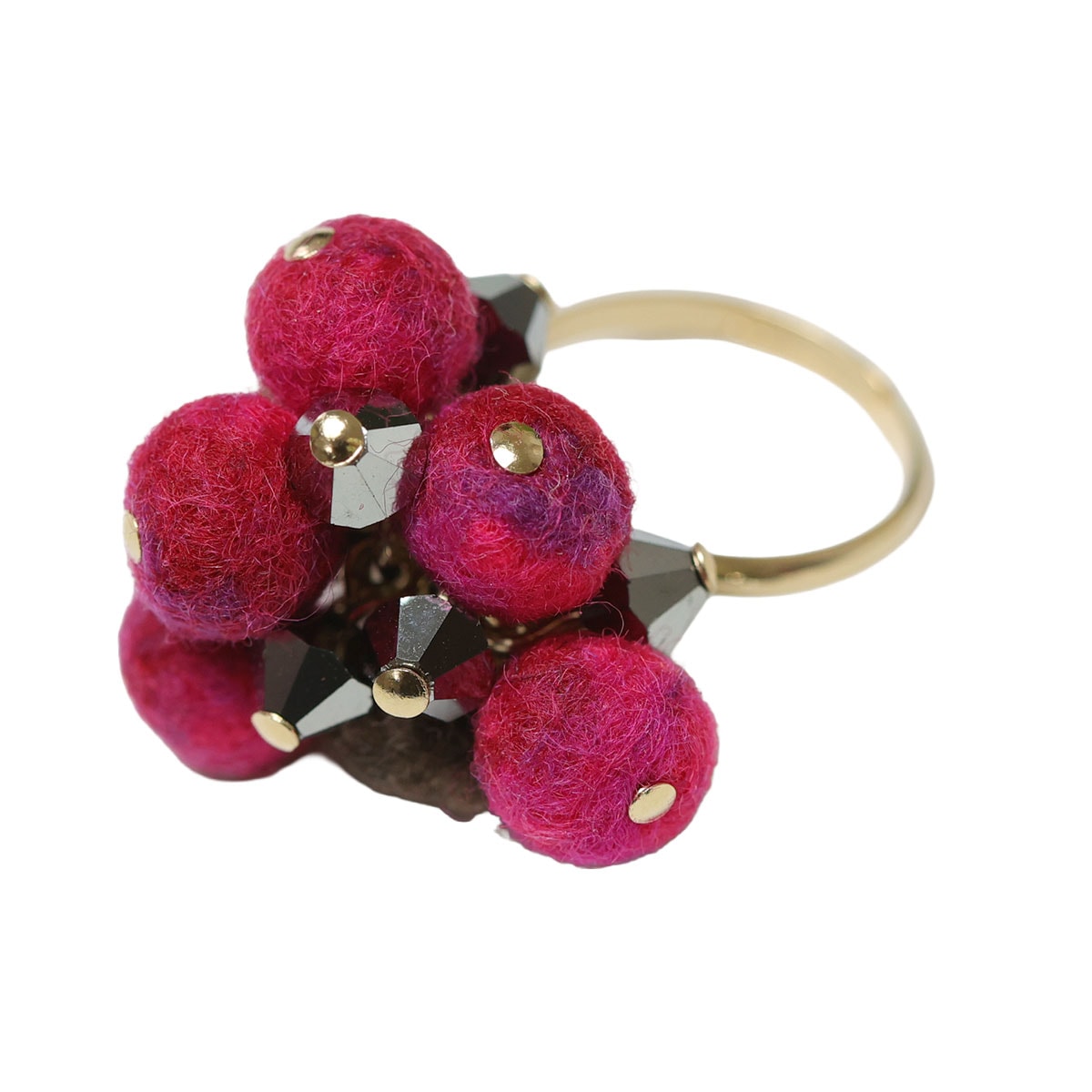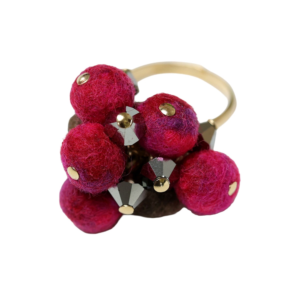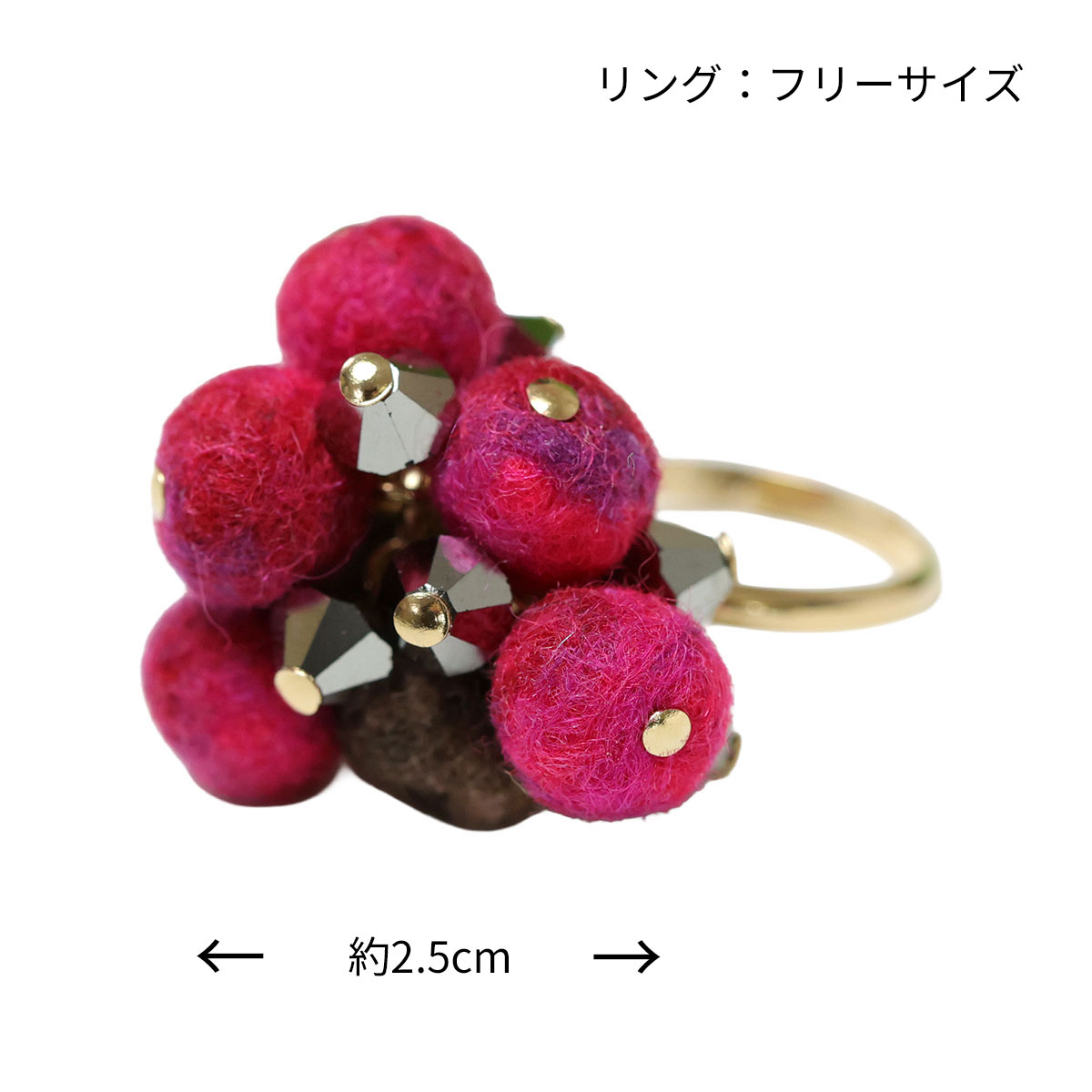 ころんとしたフェルトの粒と、きらりと輝くビジューが重なり合い、指先にふんわりとした華やかさを生み出します。